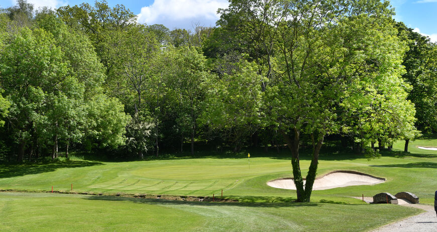 The water hazard traversing the front of the green is crossed by the Millennium Bridge with a large sand bunker to the right.
